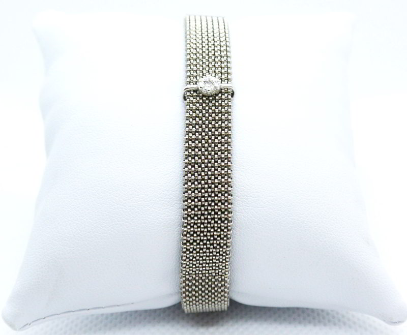 Un bracelet en acier gris extensible à enfiler et serti d'une pastille de diamants sur or gris.